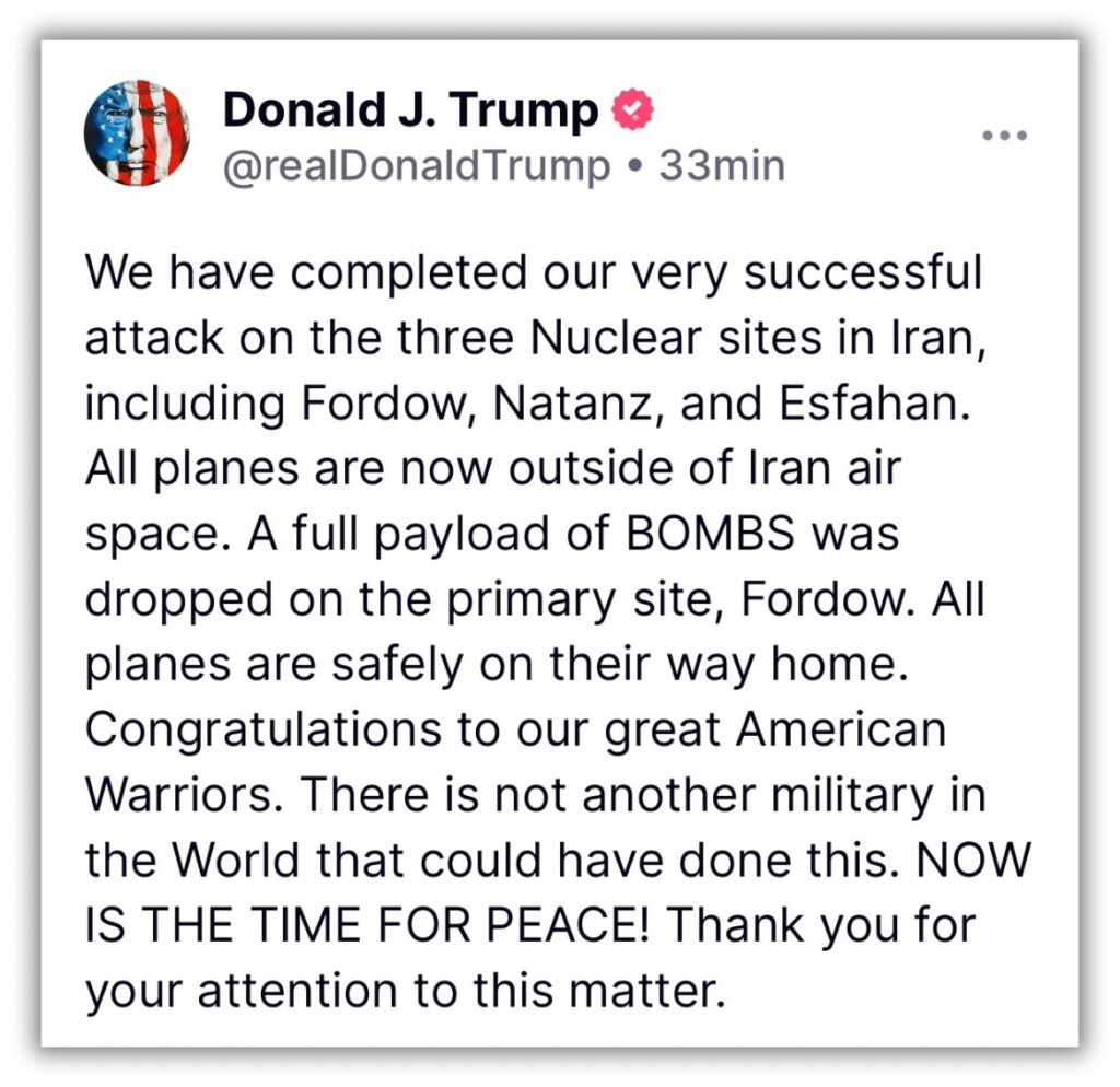 Concluímos nosso ataque muito bem-sucedido às três instalações nucleares no Irã, incluindo Fordow, Natanz e Isfahan. Todos os aviões estão agora fora do espaço aéreo iraniano. Uma carga completa de BOMBAS foi lançada na instalação principal, Fordow. Todos os aviões estão em segurança a caminho de casa. Parabéns aos nossos grandes guerreiros americanos. Não há outro exército no mundo que pudesse ter feito isso. AGORA É A HORA DA PAZ! Obrigado pela atenção a este assunto“, escreveu Trump em sua rede Truth Social.