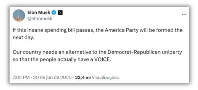 Em uma publicação feita na segunda-feira, 30, no X (antigo Twitter), o empresário anunciou inclusive o nome da nova legenda. “Se esse projeto de lei de gastos insanos for aprovado, o ‘Partido América’ será formado no dia seguinte”, escreveu Musk.