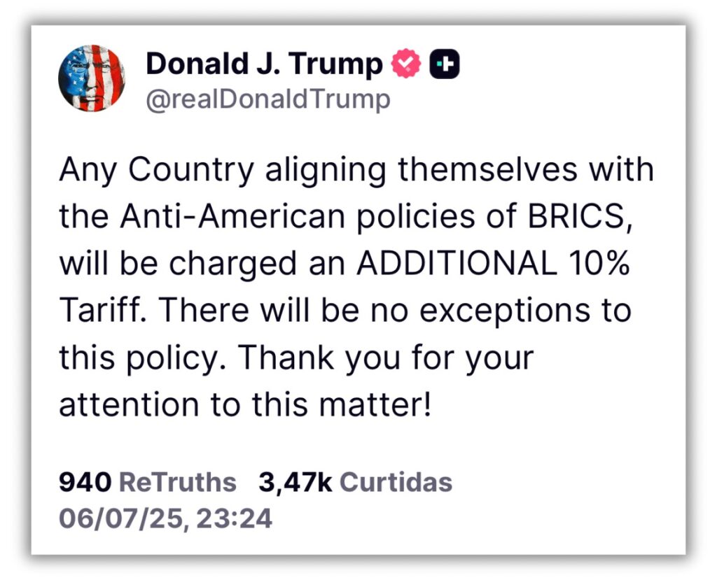 (OHF) — O presidente dos Estados Unidos, Donald Trump, declarou na noite deste domingo, 6, em sua rede Truth Social, que “qualquer país que se alinhar às políticas antiamericanas do Brics” será submetido a uma tarifa adicional de 10%, acrescentando que “não haverá exceções”.
