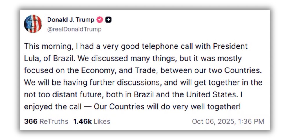 “Nesta manhã, tive uma excelente conversa por telefone com o presidente Lula, do Brasil. Discutimos muitos assuntos, mas o foco principal foi a economia e o comércio entre nossos dois países”, declarou Trump.