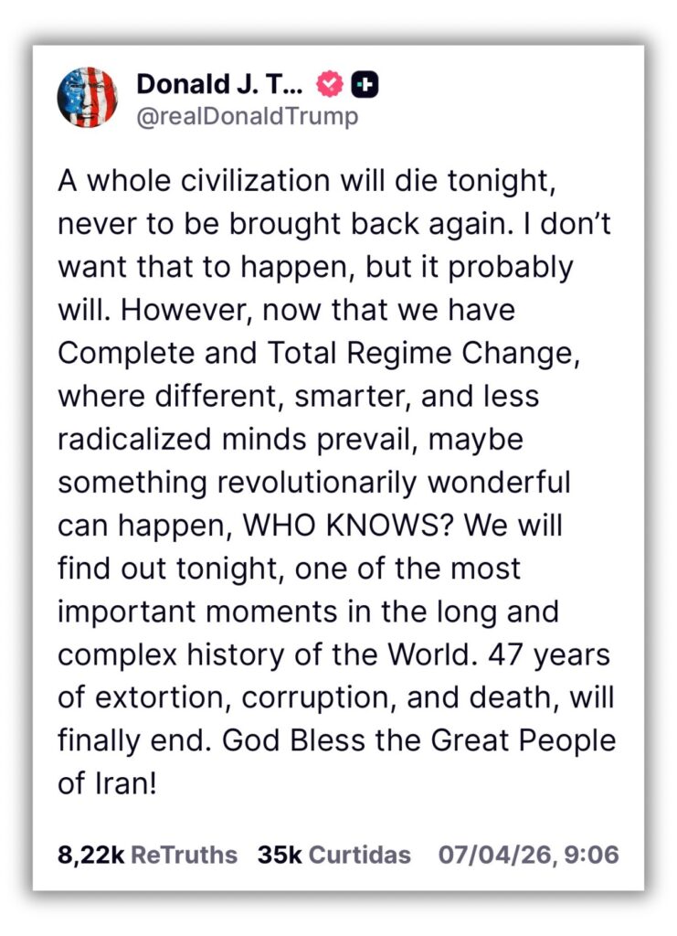 (OHF) — O presidente dos Estados Unidos, Donald Trump, publicou nesta terça-feira, 7, em sua plataforma Truth Social, que “uma civilização inteira morrerá nesta noite”, poucas horas antes do prazo final que ele havia dado ao Irã para reabrir o Estreito de Ormuz.