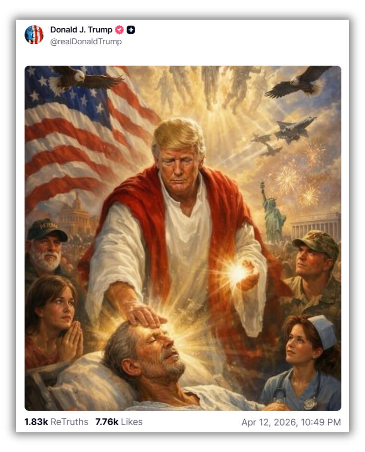 (OHF) – Minutos após publicar uma série de ataques ao Papa Leão XIV na Truth Social, na noite deste domingo, 12, o presidente dos Estados Unidos, Donald Trump, compartilhou na mesma plataforma uma imagem gerada por inteligência artificial (IA) na qual aparece retratado como Jesus Cristo.